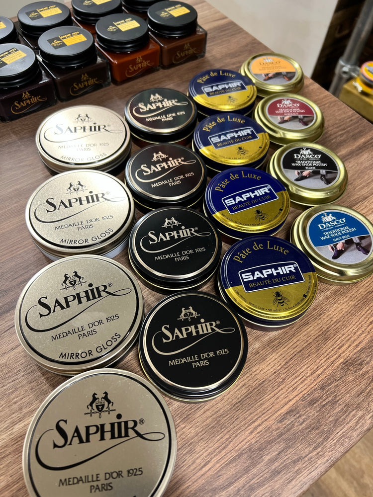 Here you'll find our range of shoe polish, from the premium Saphir Medailled D'or range to the well known Dasco renovating polish. All of our polishes are used by us in Tring shoe repairs so you can be sure that they are the Bee's knees! Simply apply with a cloth and buff to a shine with a horse hair brush.